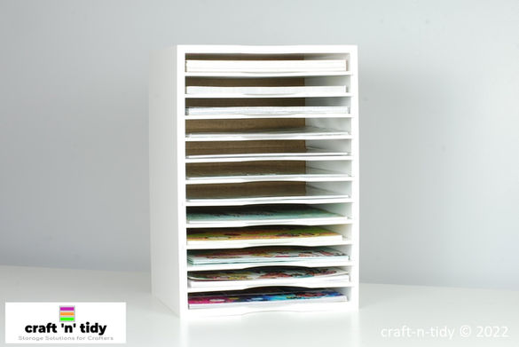 The unit comprises of 12 slots to store and organise your paper, with each shelf having a tab for labelling. The shelves are profile cut, to enable easy access to your paper. Each holder is handmade in the UK, and is supplied to you, assembled and 'out of the box ready' for you to load up with your paper.